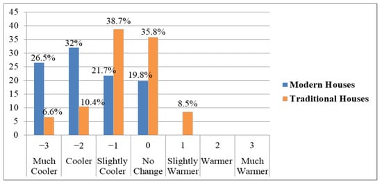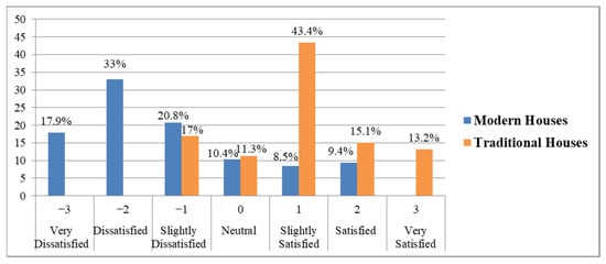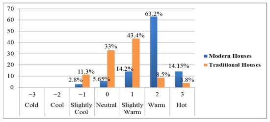 Indoor thermal comfort can be measured using subjective and/or objective methods [5]. Subjective methods include using the ASHRAE seven-point thermal sensational scale, thermal preference, standardized questioners, and interviews to assess residents’ feelings. The residents’ adaptation as well as their mood will influence this method [49]. The objective measurement approach is focused on measuring the indoor thermal comfort variables of the indoor environment such as air temperature, relative humidity, air velocity, and mean radiant temperature, and comparing these values to standards such as the ASHRAE 55 and others [50]. In this study, to compare the indoor thermal comfort of traditional houses with condominium houses, both methods were employed.