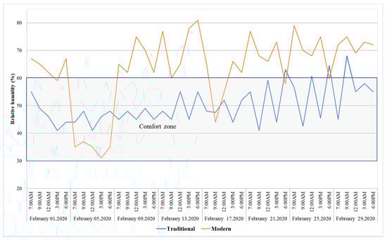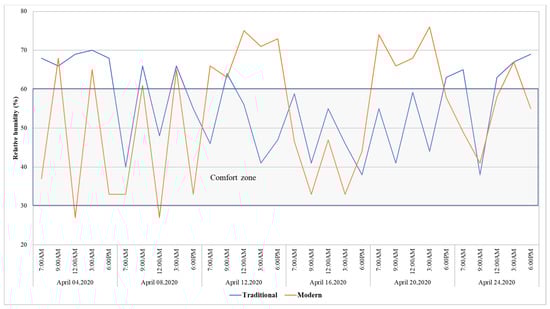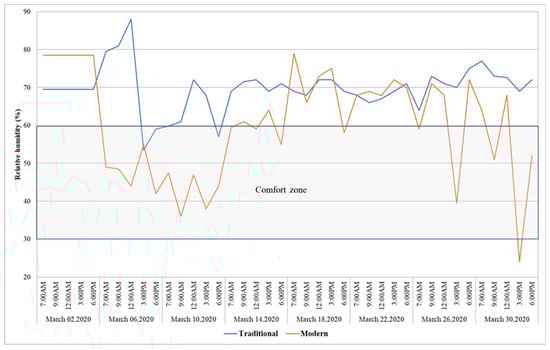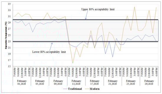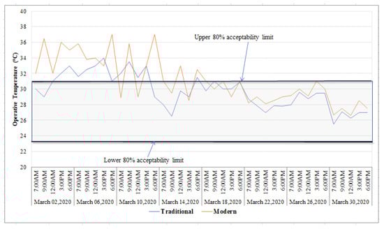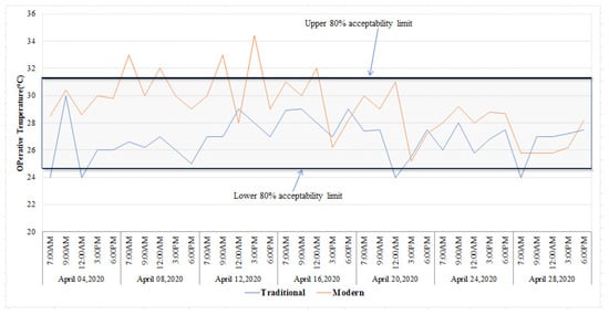 The fundamental justification for using the adaptive comfort model in this study is that both the selected building (i.e., the traditional and modern buildings) are naturally ventilated buildings, in which building occupants have access to operable windows, they have some form of heating installed which is controlled by the building occupants, and building occupants have developed some adaptive approaches to adapt to their natural environment, such as opening or closing doors and windows, changing their clothes, activity level, or their intake of hot or cold drinks. Additionally, since the prevailing mean outdoor temperatures for the months of March, April, and May are 28.37 °C, 30.37 °C, and 33.53 °C, respectively, the adaptive comfort model was used to evaluate whether the existing indoor thermal conditions of traditional and modern buildings were within the acceptability of 90% and 80% comfort limits or not in this study. Moreover, the reason for using the adaptive thermal comfort model over other thermal comfort modules (i.e., the predicted mean vote (PMV) and the predicted percentage dissatisfied (PPD)) was that it uses a wider range of operative temperature to sustain occupants’ thermal comfort. Similarly, studies have also used the adaptive thermal comfort model to evaluate indoor thermal comfort with the acceptability of 90% and 80% limits of the comfort zone [60,61,62,63].