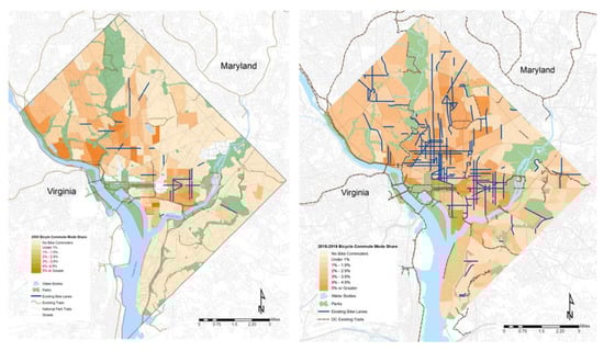 - Buehler, R.; Stowe, J. Bicycling in the Washington, DC Region: Trends in Ridership and Policies Since 1990. In Capital Dilemma: Growth and Inequality in Washington, DC; Hyra, D., Prince, S., Eds.; Routledge: New York, NY, USA, 2015; pp. 180–206. [Google Scholar]