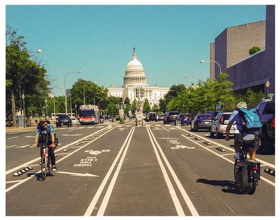 In 2014, Washington, DC published its transport master plan called MoveDC. MoveDC’s “bicycle element” called for increasing bicycling while making it safer [23]. Primary approaches included expanding and improving bicycle facilities, more bicycle-friendly policies, and more bicycle-related education, promotion, and enforcement. In addition, the plan includes details for creating a complete bicycle network comprising 136 miles of bike lanes, 72 miles of protected bike lanes, and 135 miles of trails built by 2030. MoveDC postulates that bicycle facilities should be improved and maintained whenever appropriate, as streets or sidewalks are repaved or reconstructed. According to the plan, bicycle projects should incorporate actuated bicycle signalization and special bicycle signals at key locations. Moreover, MoveDC calls for more bridge improvements for bicyclists and further increases to BLoS. Overall, according to the plan, the bikeway network should have better connectivity, better maintenance, improved safety, and better parking. The plan also called for a review of all projects to ensure that they provide bicycle accommodation [23].