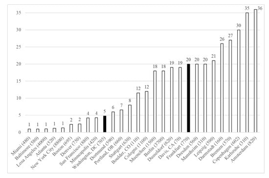 Percent of trips made by bicycle in U.S. cities, German cities, Copenhagen, and Amsterdam, 2017–2019. Note: Data for US cities are for the commute to work only. Population size of the city in parenthesis. Sources: [30,31].