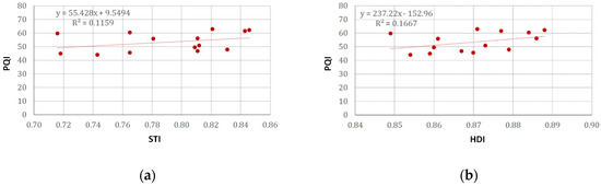 As we can see from Figure 7a, the relationship between the PQI value and the standardized STI of the population living within 300 m reveals a degree of environmental inequity. On the one hand, with the positive value of the R2 coefficient and, on the other hand, the actual positive slope of the trend line, it can be concluded that there is a causal relationship between the parks with a lower level of quality and the lower level of studies among the population living within 300 m. In spite of this, this relationship is not particularly robust, with an R2 coefficient value of 0.1159. One factor that influences this behavior lies in the lower values of some urban parks, which are much lower than the other analyzed cases. In the urban parks with better values, the relationship between their coefficient is not so clear; in other words, the higher values in a variable correspond to the highest scores in the other one.