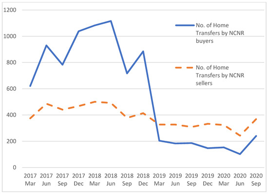 This study considered two quasi-experiments, one on the housing markets of New Zealand and the other on that of five countries. In the one-country model, the government of New Zealand provides two interventions to control two potential causes of house price hikes, namely (1) the migrants’ hypothesis [39] and (2) the housing supply hypothesis [40]. Since the enactment of the Overseas Investment Amendment Act in October 2018 in New Zealand, the number of Non-Citizen or Non-Resident (NCNR) Home Buyers plummeted substantially from an average of 800 cases before 2019 to less than 200 afterward. Whereas the average numbers of NCNR Home Sellers before and after the enactment were similar. In other words, the number of NCNR Home Sale exceeded the number of NCNR Home Purchase after the enactment, as shown in Figure 1. It acts as a good control on the migrant hypothesis via a policy intervention, i.e., the cause of house prices hike after 2019 is unlikely to be caused by migrants.