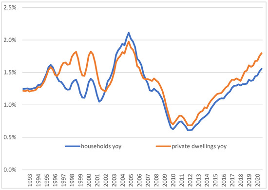 Year-on-year % changes of number of households and number of private dwellings in New Zealand, June 1992–September 2020. Source: StatsNZ (2020) [43].