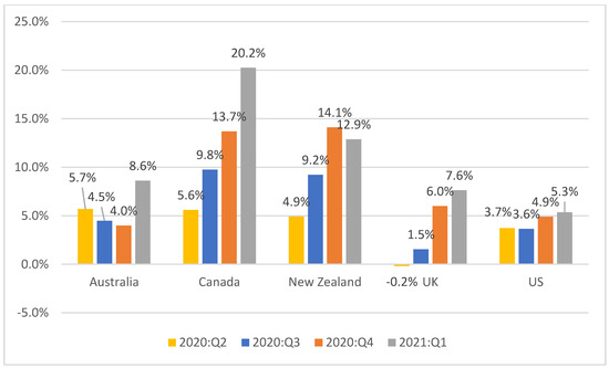 Year-on-year % change in house price indices during COVID of the five countries from Q2 of 2020 to Q1 of 2021. Source: [9].