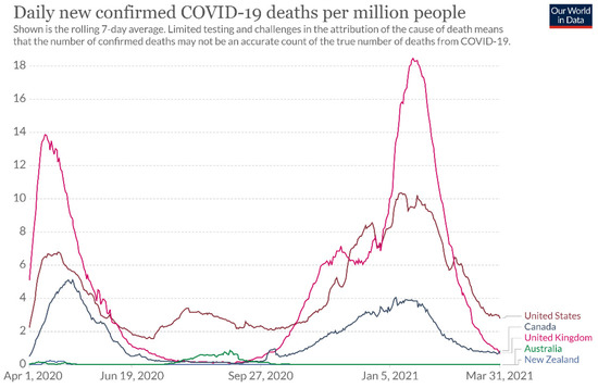 - Our World in Data. Daily New Confirmed COVID-19 Deaths Per Million People, Johns Hopkins University CSSE COVID-19 Data Extracted from Our World in Data COVID-19 Dataset. 2021. Available online: https://ourworldindata.org/coronavirus (accessed on 29 July 2021).