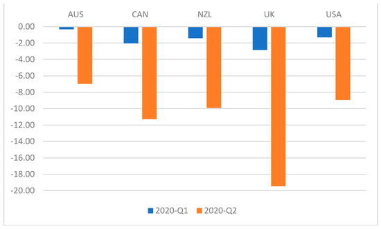 Quarter-on-quarter % change in GDP during COVID of the five countries from 2020Q1 to 2020Q2. Source: OECD [38].