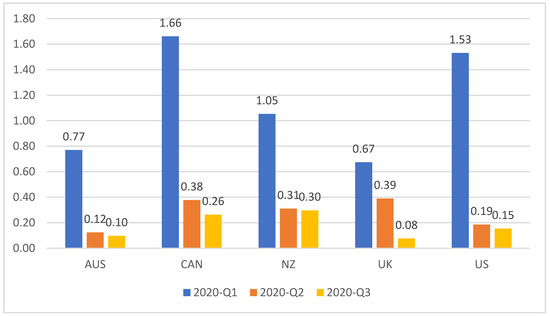 This study made use of the global recessionary period after the outbreak of COVID as a quasi-experiment to study the monetary policy hypothesis in the five-country panel analysis. Figure 3 shows the year-on-year changes of house prices of the five countries in Q3, Q4 of 2020, and Q1 of 2021. All showed positive growth rates. Canada and New Zealand, in particular, got double-digit growth rates in 2020Q4 and 2021Q1. They even showed a common trend of increasing growth rates reflecting that house price increase is not just a market price fluctuation. This phenomenon was contrary to the expectations of many people, as these countries have undergone complete or partial lockdowns, and the deadly virus has been spreading fiercely in the whole world. The 7-day rolling average of the COVID death rates relative to the population in these five countries shows two peaks in Q1 of 2020 and Q1 of 2021, as shown in Figure 4. The situations of Australia and New Zealand were better, but those in the US, UK, and Canada were worrying.