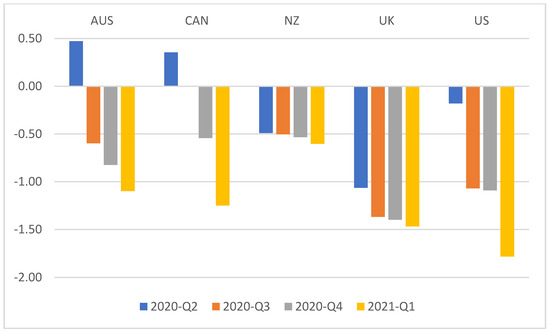 The synchronized interest rate cut is evident in Figure 6, which shows the short-term interest rates of each country before (2020Q1) and after (2020Q2, Q3) the outbreak of COVID. It resulted in a more negative real interest rate regime after 2020Q2, as shown in Figure 7. House prices globally were then rebounded with strong momentum almost at the same time. This works like an interventional experiment; when economic growth and unemployment effects are controlled to impose negative impacts on house prices, only real interest rates are reduced to test the responses of house prices globally.