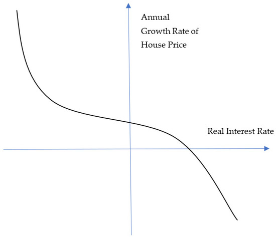 Intuitively, it is commonly believed that “cheap loans and looser lending requirements designed to stimulate the economy during the pandemic have attracted investors back into the market” [46]. Theoretically, Ryan-Collins (2018) argued that when “unlimited credit and money flows into an inherently finite supply of property, [it] causes rising house prices…” [47]. Empirically, there has been some evidence showing that abnormally low real interest rates could be associated with high property prices [18,19], yet the causality was not established until this study. Figure 9 suggests a theoretical relationship between real interest rate and house price growth for further studies.