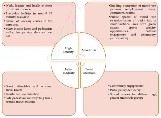 The indicators of urban compactness (density, transportation network, mixed land-use) are maintained through the following measures []: city compactness, accessibility, public transport system with cycle and pedestrian interaction, urban regeneration with the development of brownfield and greenfield land, and also public spaces.