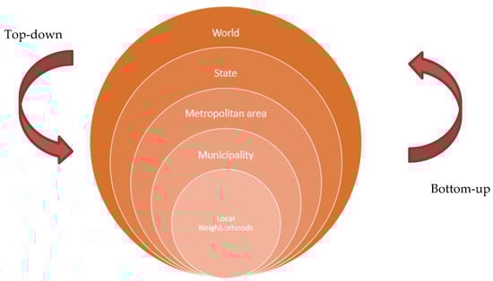 We propose that participatory democracy and shared decision-making (between bottom-up and top-down) (Figure 3) can strongly contribute to create sustainable and socio-economic solutions on a large scale, enabling a balanced, reciprocal, and communal path towards our future for establishing intrinsic change on the micro, meso, and macro level []. Even though, this issue of new approaches for governance strategies raises further quests, such as the one of borders, of spaces, of areas and of regions.