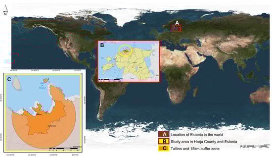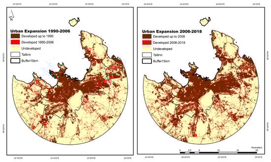 As the process of expanding the cities mainly occurs in the immediate neighboring lands from main cities [61], in line with the observations of Mozaffaree Pour and Oja [74] on the expansion of Tallinn in Harju County, we considered the buffer of 15 km from the center of Tallinn. The buffer of 15 km was chosen as this is where most of the new development occurred between 2000 and 2018, and the nearest cities and surrounding municipalities started expanding.