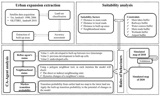 Furthermore, several studies enhanced the CA model with agent-based models to explore the drivers of urban expansion, boost the behavioral rules by defining the dynamic agents, and determine more realistic neighborhood effects to simulate urban expansion. Mustafa et al. [29] have considered a combination of CA–Logit and agent-based modeling to capture the dynamics of neighborhood interactions and static drivers of urban expansion in three levels of agents with homogeneous characteristics and behaviors. Liu et al. [53] constructed a land-use simulation and decision-support system (LandSDS), integrating agent-based and CA modeling in China for two homogeneous agents. However, models of urban expansion simulation vary in terms of data requirements, mechanisms, and application scales [48]; these models have limitations, and considerably new integrated model approaches are required to meet the complexity of urban expansion nature, which deal with spatial heterogeneity, local interactions, and neighborhood effects.