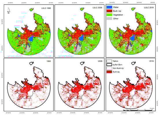In this study, the built-up areas of 1990, 2006, and 2018 were extracted from LULC images (Table 1) resulted from the Landsat images classification using the SCP plugin in QGIS 3.10. The SCP plugin has an option to download the data from the United States Geological Survey (USGS) with radiometric and geometric corrections and the spatial record (level 1C). Using processed and georeferenced data, the projection used for this study was Lambert Conformal Conic (Estonian national grid of 1997, EPSG 3301).