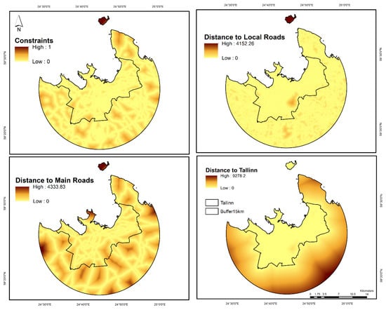 Additionally, suitability factors consist of “distance to Tallinn”, “distance to main roads”, “distance to local roads”, and “neighborhood status”. Six constraints were defined to limit the buildable lands, which was a fuzzy overlay combination of “50 m buffer of main lakes”, “30 m buffer of railways”, “25 m buffer zone of watercourses”, “50 m buffer of main roads”, “50 m buffer of the airport”, and “50 m buffer of wetlands”. The constraints, regardless of their land LULC classes, play leading roles in determining the buildability of the agents. We applied different restrictions on constraints based on the guidelines of Estonian legislation on new constructions named “Riigi Teataja”. This building code was prepared to promote sustainable development and ensure constructions’ safety and purposeful performance in Estonia. It has differentiated the construction restrictions upon the type of the protected zones, whether roads, railways, water, or other zones. Figure 5 represents the results of indices analysis.