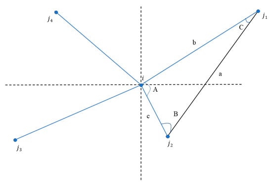 For example, as shown in Figure 1, if a node is directly connected to four other nodes, j1 to j4, then it creates four angles that sum to 360°. For a given node and its connected nodes , each angle is calculated for node and two nodes, e.g., and , that are adjacent to each other. As an example, consider the triangle to calculate the angle A shown in Figure 1. Since the information of latitudes and longitudes of the nodes , , and , and link lengths of and are known, we can calculate the distance between using the Haversine formula []. The angle is then calculated using the Cosine rule:
