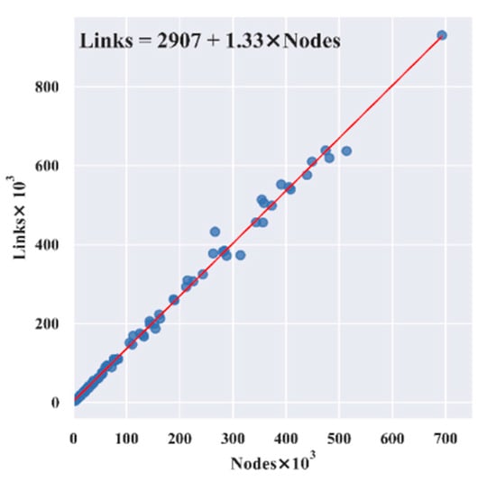 Moreover, unlike many urban properties that follow sublinear and super-linear scaling laws [], this value stays constant regardless of the size of the network. In other words, a large network follows the same pattern as a small network, likely due to the spatial feature of road systems.