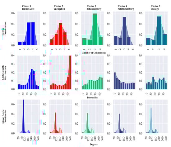 Figure 3 shows the three distributions for five representative cities from each class (discussed later). Starting with degree distribution, the most frequent degree across all cities is 3; i.e., a T-shaped intersection. This observation is in line with results showed by Lee and Jung []. The authors analyzed the streets patterns in 22 Korean cities and found that streets with three connections were more frequent than streets with four connections. In our study, the only exception is Buenos Aires where many intersections also have a degree of 4, which is a manifestation of heavy deliberate planning, strictly following a grid pattern for streets.