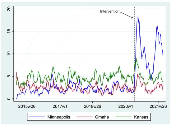 Outcome data were obtained from gunviolencearchive.org, a reputable nonprofit organization that utilizes information from over 7500 sources to triangulate the accuracy of their data collection []. Several steps are taken to validate a variety of firearm-related incident data, and links to every firearm incident are provided on the website. This database is often used in other scholarly research []. Given that the high-profile murder of George Floyd (a Black man) at the hands of police, which occurred in Minneapolis, we hypothesize that, relative to Omaha and Kansas City (two midwestern cities comparable in population size and for which data were available), we will observe the largest increase in firearm incidents in that city following the week during which Floyd’s death occurred [].