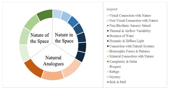 The benefits of biophilia can be achieved in urban spaces if cities are designed based on integrating nature into man-made environments. To adapt this Kellert, in 2011, suggested biophilic design; this was then promoted and applied by Beatley and Newman in 2011 and 2014 respectively, which means it is not an old concept compared to other design concepts [22,25,26]. Kellert and Calabrese (2015), in their Practice of Biophilic Design, suggested fundamental rules for the effective practice of such design [27]. They highlighted that biophilic design should sustain engagement with nature, encourage emotional attachment to place and setting, and promote an expanded sense of relationship and responsibility for both human and natural communities. This, in the end, requires integrated architectural and urban solutions. Such ideas could be implemented, for example, through the fourteen “patterns of biophilic design” [28]. These patterns are fundamentally categorised under the headings of Nature in the Spaces, Natural Analogues, and Nature of the Space, as shown in Figure 1 [28]. Regarding Nature in the space, this approach emphasizes adding seven design patterns that connect humans with nature through scenes or feelings from nature, such as visual/non-visual connections, the presence of water, and the variability of nature in terms of lighting, thermal and airflow. On the other hand, patterns regarding Natural Analogues are added through biomorphic forms by using natural materials or mimicking nature’s complexity and order. Biophilic design pattern can complexify to further ideas and include Nature of the Space, such as the mystery of space, refuge, prospect, risk, and peril.