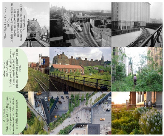 In 2001, the New York City government decided to demolish the entire High Line site in order to accommodate a new development. The Friends of the High Line strongly opposed the demolition of the historic project, and provided remarkable financial support through donation campaigns in order to preserve and redevelop the structure. In 2004, a design competition was launched aiming to preserve and transform the High Line into a public urban space. Ultimately, the landscape architect James Corner won the competition in collaboration with the Field Operations Design Firm [49,50,51,52]. Figure 2 illustrates the main milestones in the history of the High Line.