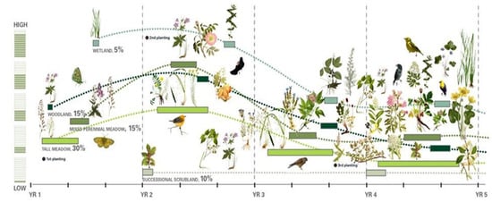 The emergence of a rich biodiverse environment on the abounded rail line serves as a lesson on the possibility of the presence of natural wildlife features in a high-end urban area. The features of wildlife appeared gradually on the surface of the rail line, with increasing diversity over time. Looking at the timeline of the High Line, the elements of biodiversity thrived on the surface of the abundant rail line. This was the spark of insight for the High Line designers to preserve the emerging biodiverse elements and to redefine them in a proper design scheme, that placed them within the redevelopment scheme. Another lesson was the impact of strategic planning in preserving biodiversity in urban spaces. The designers of the High Line embraced a temporal strategy for attracting different forms of wildlife on the surface of the High Line, in different stages and with different features; thus, a natural and biodiverse ecosystem thrived. Figure 6 illustrates the emergence of wildlife features within specific timeframes. As demonstrated in the diagram, the diversity and integrity of wildlife features increases over the time to include a wider range of creatures. This process was exemplified in the case of the High Line. Consequently, the biodiverse environment that has been emerging on the abandoned rail line has inspired the community to preserve the structure and redesign the rail line in a way that maintains the biodiversity of the place and presents an interactive urban space for the citizens of New York City [49,50,51].