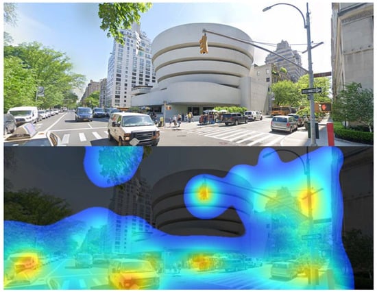 The Guggenheim Museum is “there,” but its design is incomprehensible neuroaesthetically. Top: The Guggenheim Museum in New York City. Image retrieved from Google Maps. Bottom: The Guggenheim Museum analyzed using 3M’s Visual Attention Software (VAS). Eye tracking data and visualization by N. H. Buras.