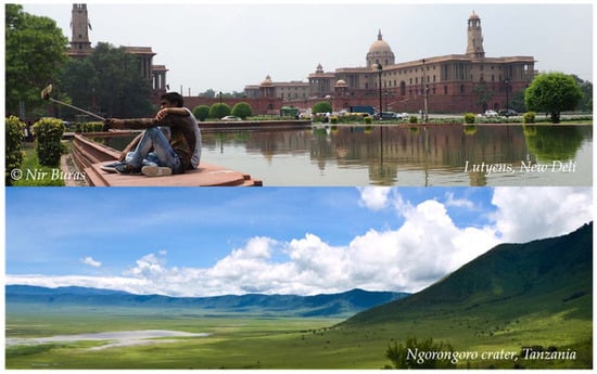 Lutyens’s New Delhi (Top) and the African Savannah (Bottom) share fractal qualities, as opposed to the non-fractal plainness found in more modern buildings. Photos: New Delhi, Nir Buras; Ngorongoro Crater, William Warby, CC BY 2.0 Wikimedia Commons, https://commons.wikimedia.org/wiki/File:Ngorongoro_Crater.jpg (accessed on 30 December 2021).