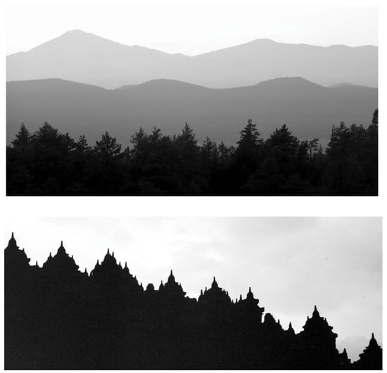 The top image shows several examples of natural fractal profiles with low (hill) and high (trees) D values. Fine structure contributes to the fractal pattern generated by trees making it much greater than for hills, which leads to a higher D value. The image below shows an example of a similar profile in buildings. Traditional architecture, such as the Borobudur Temple in Indonesia, features mid-D fractal profiles. Figure and photo by R. P. Taylor.