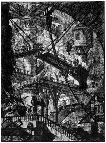 George Santayana observed that there must be in our nature a powerful tendency to observe beauty and value it, such that “No account of the principles of the mind can be at all adequate that passes over so conspicuous a faculty” []. But it was philosopher Edmund Burke who in 1757 made the seminal contributions to this debate by arguing that aesthetic experiences, such as those of the beautiful and the sublime, arise from the same neural processes that cause the primary driving emotions of love and fear []. With the opposite of pleasure being pain, philosophers such as Burke suggested that pain, fear, and terror could provoke types of aesthetic experience perhaps even more powerful than those associated with beauty and pleasure. In his Carceri, Piranesi drew what terrifying spaces might look like (Figure 5). (Note that, while colloquially the term “sublime” often means, “the highest degree or point, summit, or acme of …”, it is used here as a technical name for the pain- or terror-based aesthetic experience, much like the distinction between “terrific” and “terrible.” That was the correct usage of the terms when they were in common use: “determine at first, whether the building is to be markedly beautiful or markedly sublime”. The Englishman John Ruskin understood the sublime and the beautiful to be opposites. The sublime appears to be less of a primary philosophical and art driver among French, Spanish, and Italian speakers. German language does not make this distinction as clearly, partially explaining the particular traits of German philosophy and Romanticism.) We do not wish to get into computing fractal dimensions in this paper, and only mention that Piranesi’s imaginary prisons lack the ordering of a mid-range fractal that seems far more natural hence less threatening [,,,,,,].