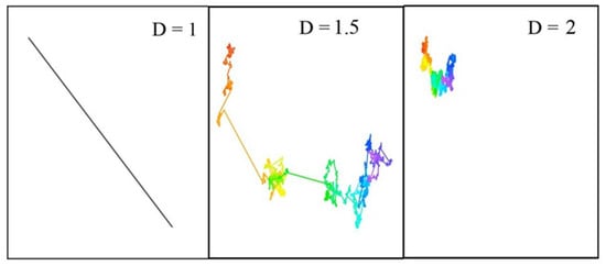 When the contribution of fine structure to this fractal mix is increased, the line gradually fills in the 2-dimensional surface of the retina and the visual fractal’s D value therefore approaches 2. Although there are examples of natural fractals with D values from 1.1 to 1.9, the most common lie in the narrower range between 1.3 and 1.5. This is an experimental finding from measuring the D value of various natural objects [,]. As examples, many clouds and trees lie in this range. This observation informs the fractal fluency model, which proposes that humans have adapted to efficiently process these mid-complexity patterns that determined the evolution of our perceptual system.