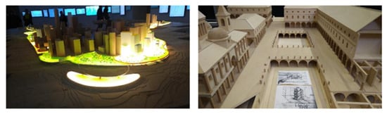 Left: Humanhattan 2050, by Bjarke Ingels Group, photo: Borruso G, “Biennale”, Venezia, 2018. Right: Leonardo, mockup of a “Città ideale” (Ideal City), photo: Borruso G, Trieste, 2019.