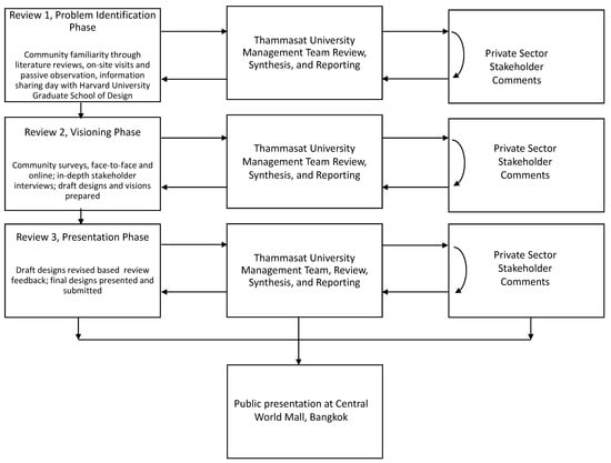 The three senior authors that formed the study management team from Thammasat University met with the private sector partners on a monthly basis. The role of the study management team was threefold: (i) review all designs and visions submitted by the students in each class and, in consultation with the course coordinators, synthesize the results of high quality and innovative designs and visions for presentation to the private sector partners as part of the regular monthly project meetings; (ii) consider the private sector partner comments on the draft designs and visions and escalate their suggestions to the course coordinators and classes; and (iii) provide additional review and synthesis of community surveys as part of the regular meetings with the private sector partners. The monthly private sector partner meetings were valuable to iteratively and interactively inform the final plans and designs. The general structure and flow of the research design is summarized in Figure 1. As noted in Section 1.3, the pragmatic research through designing approach was employed in this study, integrating aspects of (post)positivist, constructivist, and advocacy/participatory epistemologies. Lenzholzer et al. [] noted that the pragmatic approach will typically consider “natural and cultural aspects as well as design procedures, often within a certain geographical context”, and may include… “a series of different studies that are carried out in parallel or in sequence”. This parallel or sequence of efforts must be meaningfully integrated into the overall study, as illustrated in Figure 1.