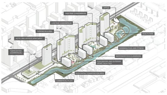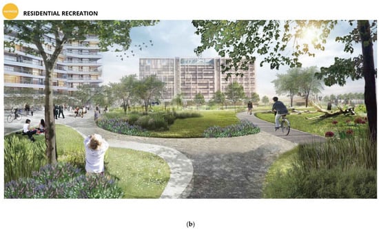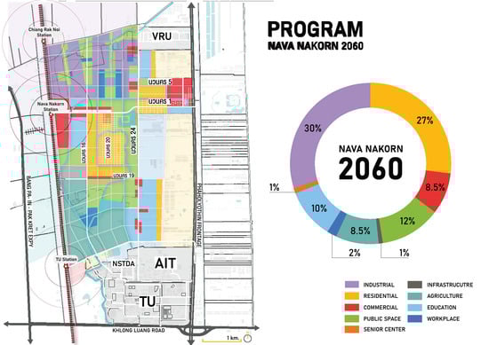 Figure 3 and Figure 4 summarize the current land use and a vision of possible land use by 2060, focusing on the VRU/Nava Nakorn/Thammasat University corridor. Greater green space/public space is represented throughout the superblock, as guided by the findings of the community surveys. Emphasis on green space is a trend that is also consistent with New Urbanism and has gained some focus in Southeast Asia [,,]. A number of Smart City indexes have included a measure of green space as being a positive indicator of “smartness” [,,,]. The role of green space planning in accommodating the new normal of COVID-19 is also an emerging theme, particularly with respect to green space form, distribution, connectivity, and resilience [,,]. Interestingly, Ciupa and Suligowski [] found that those counties with a higher number of green-blue spaces in Poland had a significantly lower total number of COVID-19 infections and deaths.