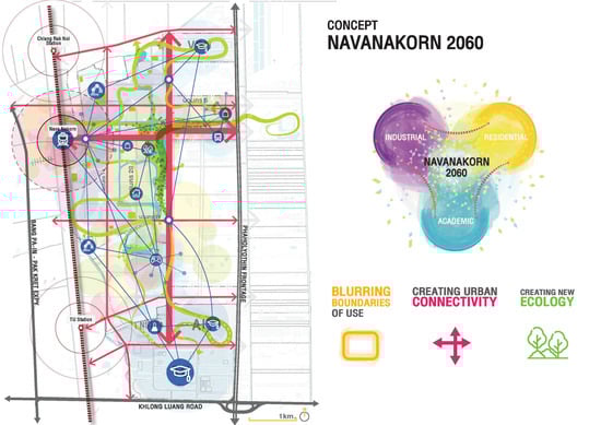 VRU/Nava Nakorn/Thammasat University corridor development vision, with the themes of blurring boundaries in land use, creating urban connectivity within the smart district, and creating a new ecology through enhanced green space planning and connectivity. The extension of the SRT Dark Red Line to Nava Nakorn is visioned to the west, with enhanced internal connectivity of shuttle-bus service represented by the red arrows. Graphics credits to Thanakit Singduang, Thanyamon Traimittaparp, Areerat Joemkor, Kotchakorn Chaiyatum, Apicha Promnao, Thannicha Charoenwan, Thanawit Likhitworasak, Phatharamon Panon, Nanthicha Jiwatjanarodom, AR416 class.