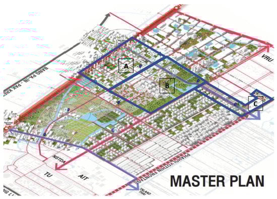 Master-plan overview of Smart City development within the VRU/Nava Nakorn/Thammasat University corridor. Planning zones A, B, and C are outlined with blue lines and are shown in more detail in Figure 8a–c.