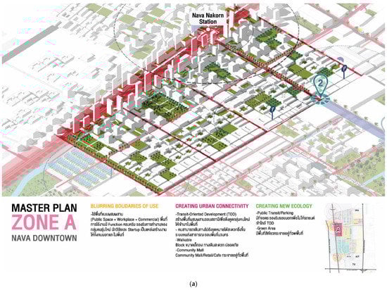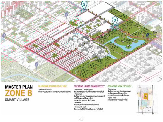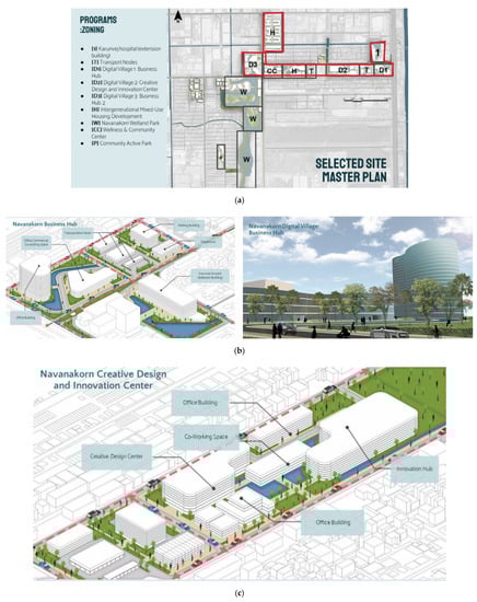 The “Digital Village” area of Nava Nakorn aligns along the main east–west corridor in planning zone C of Figure 7 and Figure 8c. The Digital Village was a concept proposed by the private sector partners as an opportunity for the development of currently vacant land near the main entrance to Nava Nakorn. The private sector partners envisioned that this area could be developed into a meeting and work place where companies operating in Nava Nakorn and students from the local universities could collaborate on ICT, high-tech research, and entrepreneurial initiatives in a form of private–public partnership. The space might be both a physical space and a virtual meeting space, a vision consistent with the Thailand 4.0 policy.