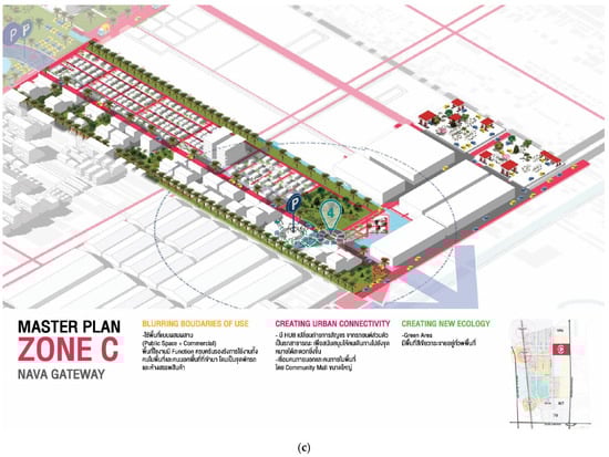 (a) Master-plan overview of zone A (from Figure 6), emphasizing development opportunities in the immediate area of the Nava Nakorn BTS station. Graphics credits in Figure 6 and Figure 7 to Thanakit Singduang, Thanyamon Traimittaparp, Areerat Joemkor, Kotchakorn Chaiyatum, Apicha Promnao, Thannicha Charoenwan, Thanawit Likhitworasak, Phatharamon Panon, Nanthicha Jiwatjanarodom, AR416 class. (b) Master-plan overview of zone B (from Figure 6), smartvillage development with ample connected green space/public space to enhance livability and manage localized flooding. (c) Master-plan overview of zone C (from Figure 6), Nava Nakorn gateway, including potential Digital Village and residential development.