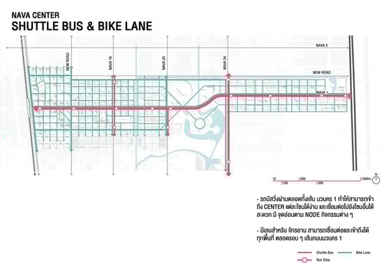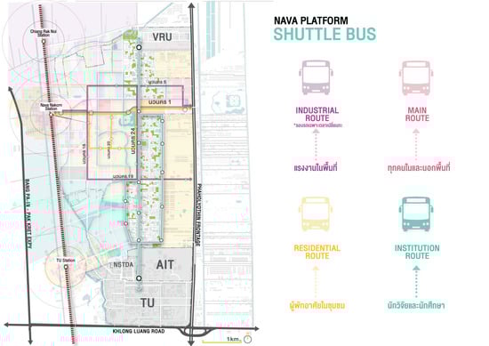 Shuttle-bus network and dedicated bike paths connecting the SRT red line extension terminus with the heartland of Nava Nakorn. Graphics credits to Thanakit Singduang, Thanyamon Traimittaparp, Areerat Joemkor, Kotchakorn Chaiyatum, Apicha Promnao, Thannicha Charoenwan, Thanawit Likhitworasak, Phatharamon Panon, Nanthicha Jiwatjanarodom, AR416 class.