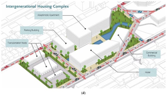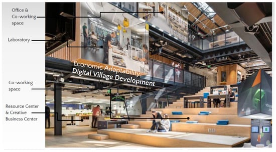 Figure 10a–d illustrate one design vision that integrates business and commercial opportunities with housing, health facilities, and public transport nodes in the Digital Village. Collectively, this design includes aspects of DEPA’s Smart Economy, Smart Mobility, Smart Living, and Smart Environment pillars that would enhance community wellbeing and resiliency to natural and economic disruptions. This design vision explicitly embraced the concept of co-working office space (Figure 11). Co-working offices are generally building locations that offer desk space for a fee, but they also hope to attract those looking for a comfortable and aesthetic work environment that provides valuable social contacts and collaboration with other professionals [,]. This type of arrangement may be of particular interest to self-employed creative professionals, freelancers, start-ups, and knowledge workers [], and is increasingly popular in North America, Europe, Australia, and parts of Asia [,,]. However, uptake has been slow in Thailand, with most co-working spaces occurring informally at coffee shops and cafes [].