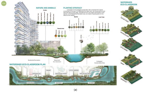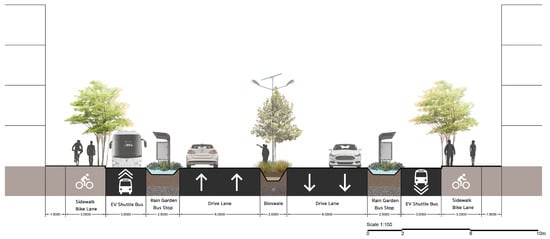 The community surveys identified a general perception of inadequate green space and public space. Figure 5 summarizes one vision of green space/community space for the heartland of Nava Nakorn. This design emphasizes the enhanced opportunity for a variety of community activities at an outdoor community-events center that would be inclusive of the diverse ethnic and socio-economic demographics, which is an issue of concern identified by Rigolon et al. []. Community activities may include cultural festivals, food fairs, holiday events, and concerts. The eco-park and community park areas would provide healthy recreational and social space as well as enhancing biodiversity. The collection of green spaces in Figure 5 provides flexibility and resiliency within the new normal COVID-19 era, as some areas are smaller, calming nature areas, while the larger outdoor community-events center would have sufficient capacity to accommodate larger crowds under non-restricted times, but also the opportunity for social distancing of smaller groups should such measures be re-enacted. The theme of connectivity is emphasized in Figure 5; connectivity of WSUD features and drainage through the heartland of Nava Nakorn for sustainable water management, but also connectivity with respect to nature trails, walking, and bicycle paths that will facilitate the flow of people to and from nearby residential and commercial areas (including a transportation hub for local bus service). In a user survey of public spaces in Tokyo, Neto et al. [] found that tree-coverage density was the best predictor of desirability, but greenery and street furniture were also important. These results from Tokyo are consistent with the findings from our community survey and were incorporated into the physical designs presented in this paper.