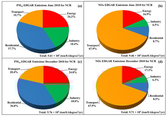Contribution of different sectors to PM10 (a,c) and NOx (b,d) EDGAR emissions over NCR in June 2010 (upper panel) and December 2010 (lower panel) at 0.1° × 0.1° resolution (EDGAR emission inventory).