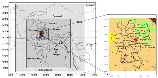 The WRF-Chem model requires terrestrial and meteorological data inputs. USGS 24 classification category land-use data was used to interpolate topography and land use with a spatial resolution of 30″. Meteorological initial and boundary conditions were obtained from the National Centre for Environmental Prediction (NCEP), with final analysis data (FNL) of 1° resolution. These datasets can be downloaded from the WRF model website [35]. As described in the previous section, the model’s chemical module requires emission input obtained from EDGAR. Chemical initial and boundary conditions were extracted from the model for ozone and related chemical tracers, version 4 (MOZART-4) global chemical transport model. The simulation domain is shown in Figure 2. The parent domain covers part of Asia at a resolution of 54 km × 54 km, the first nested domain surrounds India at 18 km × 18 km, the second nested domain at a resolution of 6 km x 6 km and the third nested domain encapsulates the National Capital Region (NCR). The fourth domain encompassing the NCR includes the National Capital Territory (NCT) of Delhi and surrounding areas (i.e., 22 districts) of Haryana (13 districts), Uttar Pradesh (7 districts), and Rajasthan (2 districts), representing the land-use land-cover of the region, as designated by the U.S. Geological Survey (USGS) 24 category dataset. The dominant land-use land-cover across the entire region is dry cropland, with some parts of Delhi under the urban and built-up land category. The changes in emissions were implemented for the Delhi region in the third nested domain.