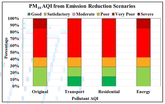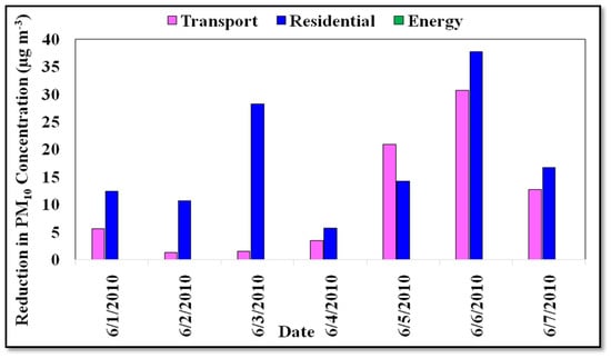 Therefore, reductions in both PM10 and NOx are studied to understand the impact on pollutant concentrations. Figure 3 shows the reduction observed for simulated PM10 concentrations for the three emission control scenarios. In the residential sector, with a decrease of 68.4% in PM10 emissions, the simulated PM10 concentrations showed a decrease that varied from 5.5 µg m−3 to 38 µg m−3. A decrease of approximately 29.1% in PM10 emissions in the transport sector resulted in a decrease of 1.5–31 µg m−3 in PM10 concentrations. For a 68.4% reduction in PM10 emissions in the residential sector, an average 8% decrease was observed in PM10 concentration. In the transport sector, a decrease of approximately 5% was noted in PM10 concentration as a 29.1% reduction in PM10 emissions. It was noted that, for the energy sector, because the change in emissions for PM10 was negligible, no change was observed for the simulated PM10 concentrations.