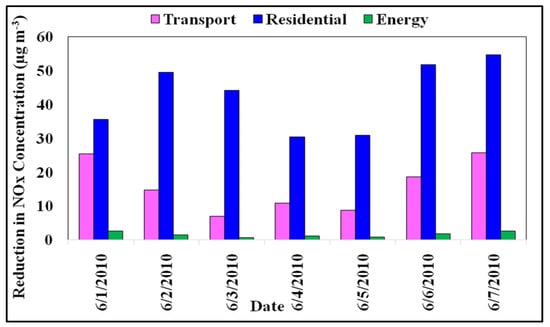 - A significant decrease of about 49.8% (30 to 56 µg m−3) was noted in NOx concentrations in the residential sector, in addition to an 18.9% (5 to 26 µg m−3) decrease in the transport sector.