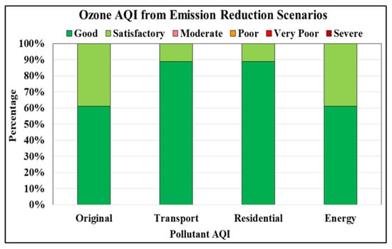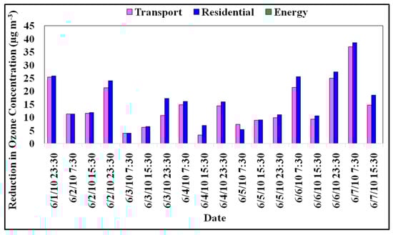 Figure 5 shows the reduction observed for simulated ozone concentrations for the three emission control scenarios. For the residential sector, with a decrease of 69.47% in NOx emissions, the simulated ozone concentrations showed a decrease ranging between 4 µg m−3 and 38.5 µg m−3. With a decrease of approximately 23.6% in NOx emissions in the transport sector, the decrease noted for ozone concentrations was between 3 µg m−3 and 37 µg m−3. For a 69.47% reduction in NOx emissions in the residential sector, a decrease of approximately 47.7% was observed in ozone concentration. In the transport sector, a decrease of about 44.1% was noted in ozone concentration with a 23.6% reduction in NOx emissions. While a slight reduction in NOx concentrations was observed for the NOx emission reduction in the energy sector, no change was noticed in ozone concentrations. Thus, change in the energy sector did not contribute to ozone production, unlike the other sectors, such as transport and residential.