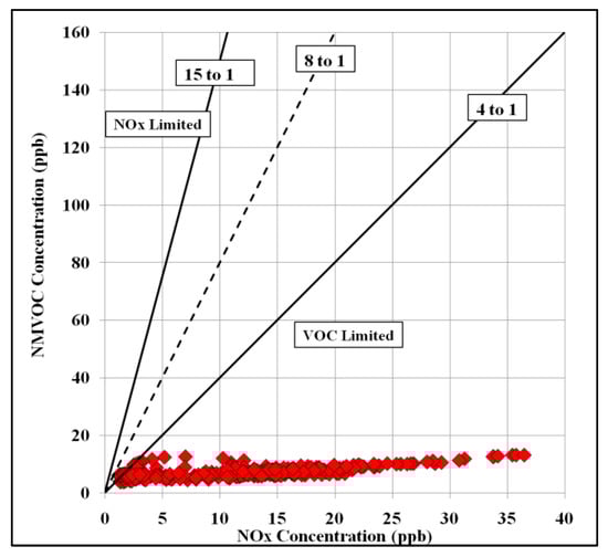 Ozone is produced by a cycle of reactions involving two basic pollutants: NOx and VOCs. Thus, it is vital to understand the role of both VOCs and NOx emissions in ozone formation. For this purpose, VOCs-to-NOx ratios were studied. Figure 6 represents scatter plots of NMVOCs to NOx ratio. An area is considered VOC-limited at low VOCs-to-NOx ratio, i.e., less than approximately 4 to 1. For a high ratio, greater than approximately 15 to 1, the region is classified as NOx-limited. In a NOx-limited regime, O3 concentrations increase with increasing NOx and are insensitive to hydrocarbons, while in a VOC-limited regime, O3 concentrations increase with increasing hydrocarbons (VOCs). Therefore, the formulation of a successful strategy against O3 pollution requires knowledge of the chemical regime for O3 production. In a VOC-limited regime, VOC emission controls cause a decrease in O3 levels. However, in the NOx-limited regime, VOC emission controls are of no benefit in decreasing O3 [39]. Scatter plots of NMVOCs to NOx ratio show whether the ozone concentration production is VOCs limited or NOx limited. In Figure 6, it can be inferred that for all simulations performed, ozone production was NMVOC limited. Various sources contribute to VOCs emissions, such as vehicular exhaust, refuelling stations, industrial hubs, diesel generator sets, etc. Srivastava et al. [40] reported source contribution to total VOCs for a traffic junction in Delhi as 43% from diesel exhaust, 24% from gasoline, 19% from evaporative, and 14% from other sources. Overall, in Delhi, approximately 26% to 54% of VOCs are emissions from diesel internal combustion engines [40]. As ozone production is VOC-limited, reducing VOC emissions can further help reduce ozone concentrations.