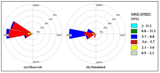 Wind rose plots displaying the wind direction and wind speed for simulated period over Delhi. (a) Observed, (b) simulated.