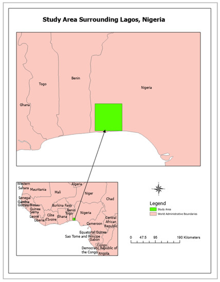 The primary focus of this study is Lagos, Nigeria, situated within latitudes 6°23′ N and 6°41′ N and longitudes 2°42′ E and 3°42′ E [19]. Lagos is the chief port in Lagos State, Nigeria. It is a rapidly growing (both spatially and demographically) urban hub in the African continent. About 65% of Nigeria’s industries are based in Lagos, and they account for about 32% of Nigeria’s national gross domestic product (GDP) [20]. From 1866 to 1911, Lagos’ total population grew from 25,000 to 73,766, covering a total area of 46.6 square kilometers. In 2006, this number reached 9,113,605 and the urban area expanded to 3345 square kilometers [19]. As of 2021, Lagos’ population is about 14,862,111 with an urban coverage of 1171.28 square kilometers [21].